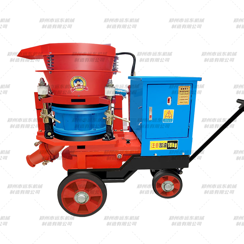 干式喷浆机是往料斗里加入的被喷射的原料(混凝土、水泥等)是干的喷射混凝土的设备,通过空压机施加压力,把干料送到喷头处,喷头处有进水管,干料在喷头处经过与水混合然后喷射出去。广泛适用于矿山、隧道、涵洞、地铁、边坡支护、水电工程、地下工程及煤矿高瓦斯矿井巷道喷射混凝土施工作业。